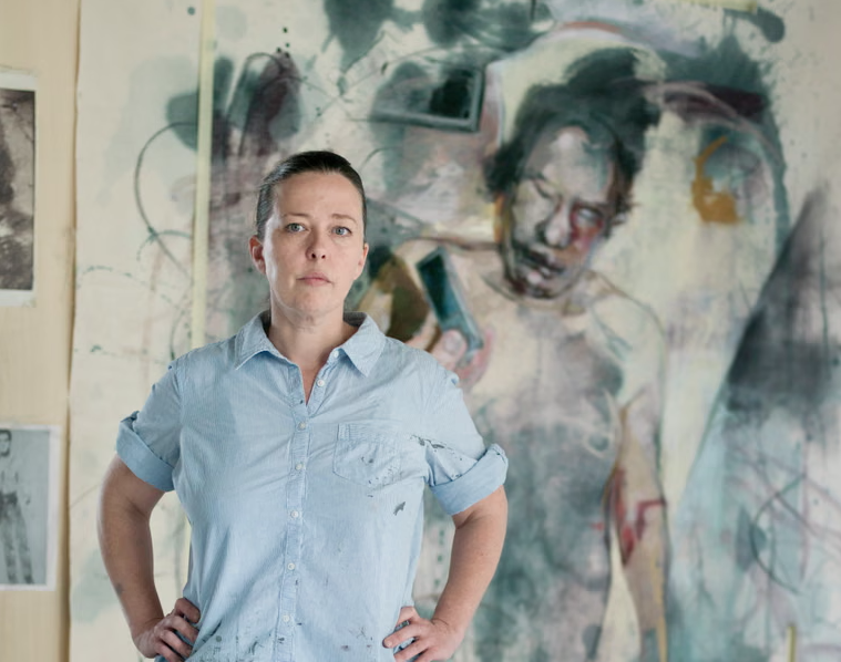 Her paintings confront the shame, fear, and fascination that society attaches to women’s flesh, whether it’s cellulite, stretch marks, or the natural curves of aging.